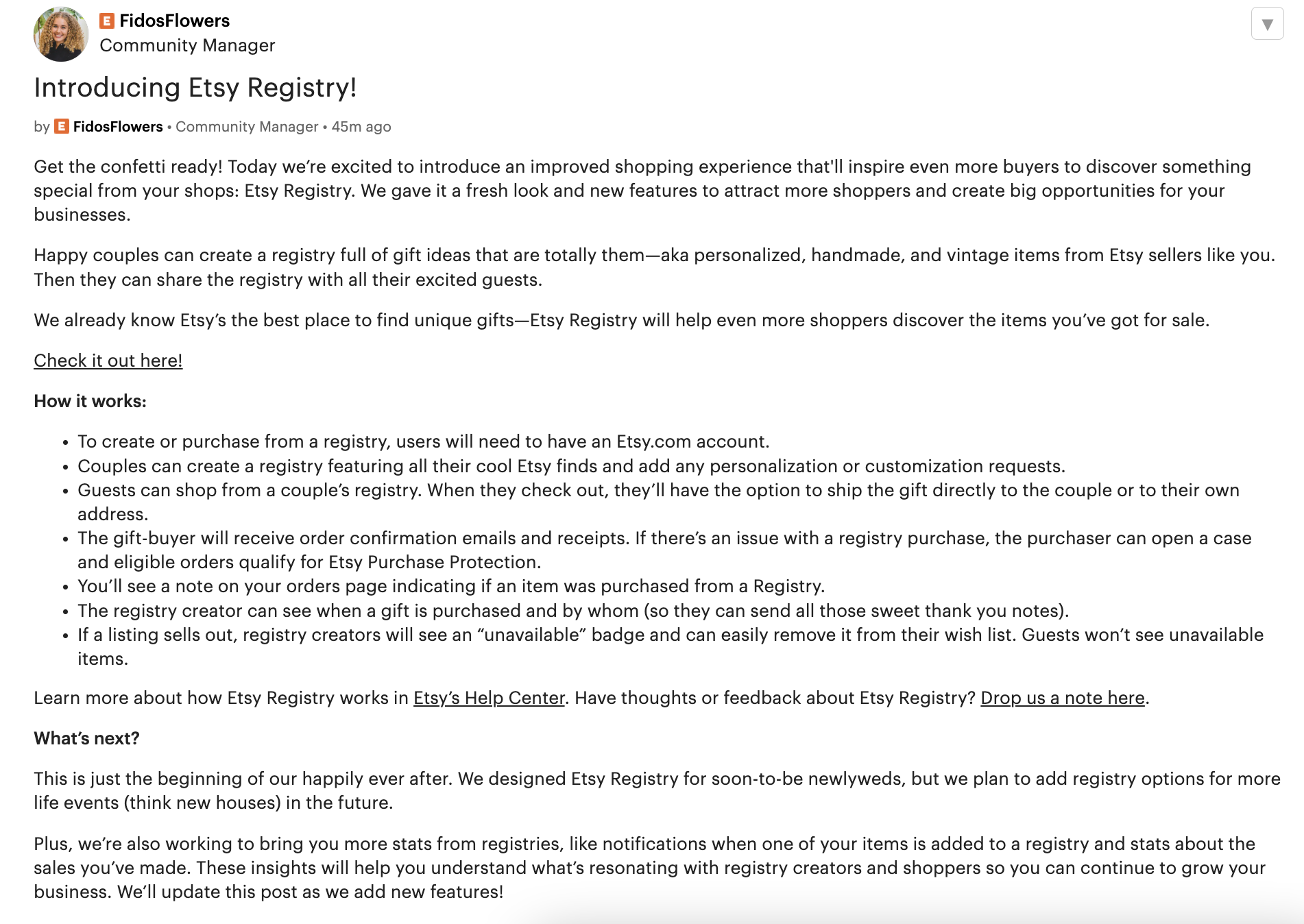 - Post introducing Etsy’s new Chief Product Officer to seller community