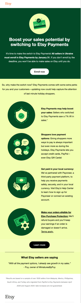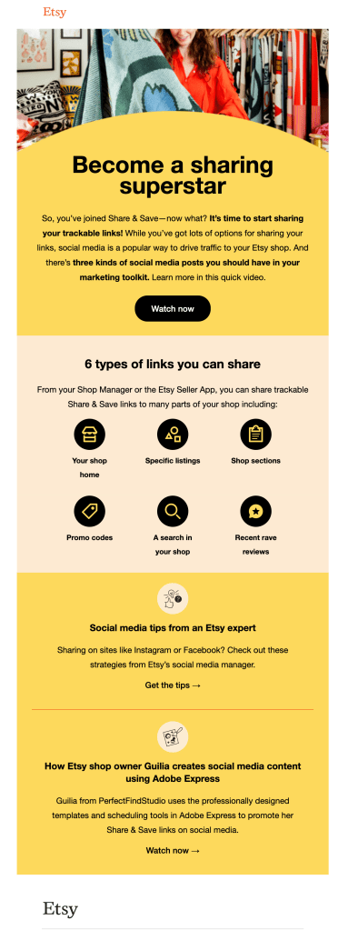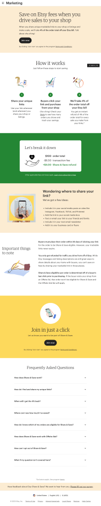 Led GTM content strategy and naming for Share & Save a program that rewards Etsy sellers for the traffic they drive to their own shops. The adoption campaign resulted in 42% of all Top & Power sellers joining the program, driving both increased site traffic and gross merchandise sales.
